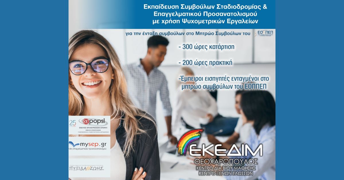 Το Κέντρο Δια Βίου Μάθησης ΕΚΕΔΙΜ ΘΕΟΧΑΡΟΠΟΥΛΟΣ, πιστοποιημένο από τον ΕΟΠΠΕΠ με κωδικό πιστοποίησης 2000178 και εγγεγραμμένος φορέας παροχής υπηρεσιών Συμβουλευτικής Επαγγελματικού Προσανατολισμού στο επίσημο Μητρώο(Συ.Ε.Π.) του ΕΟΠΠΕΠ, σε συνεργασία με τον Εκπαιδευτικό Όμιλο ΆΠΟΨΗ, την Εταιρεία Συμβουλευτικής & Ψυχοκοινωνικής Υποστήριξης με διακριτικό τίτλο “ΠΥΞΙΔΑ ΖΩΗΣ” και την πύλη Επαγγελματικού Προσανατολισμού mysep.gr διοργανώνει το μοριοδοτούμενο εκπαιδευτικό Πρόγραμμα: