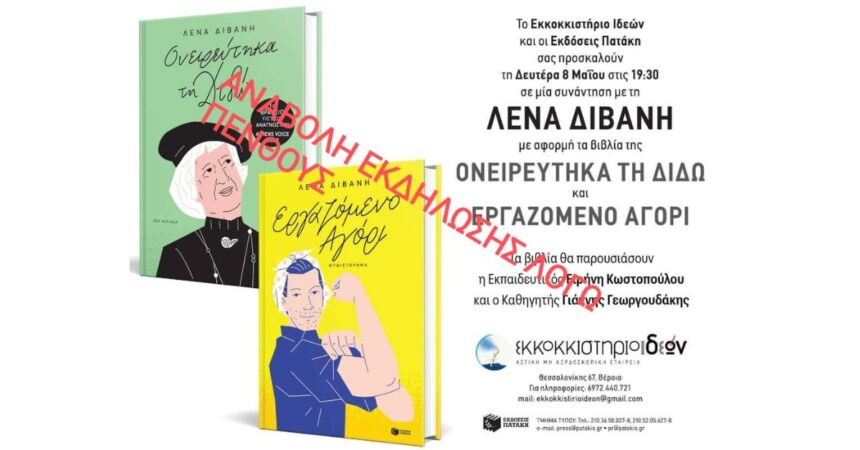 Η συνάντηση με την συγγραφέα Λένα Διβάνη που επρόκειτο να γίνει την Δευτέρα 8 Μαΐου στις 7.30 μ.μ. αναβάλλεται ΛΟΓΩ ΠΕΝΘΟΥΣ.