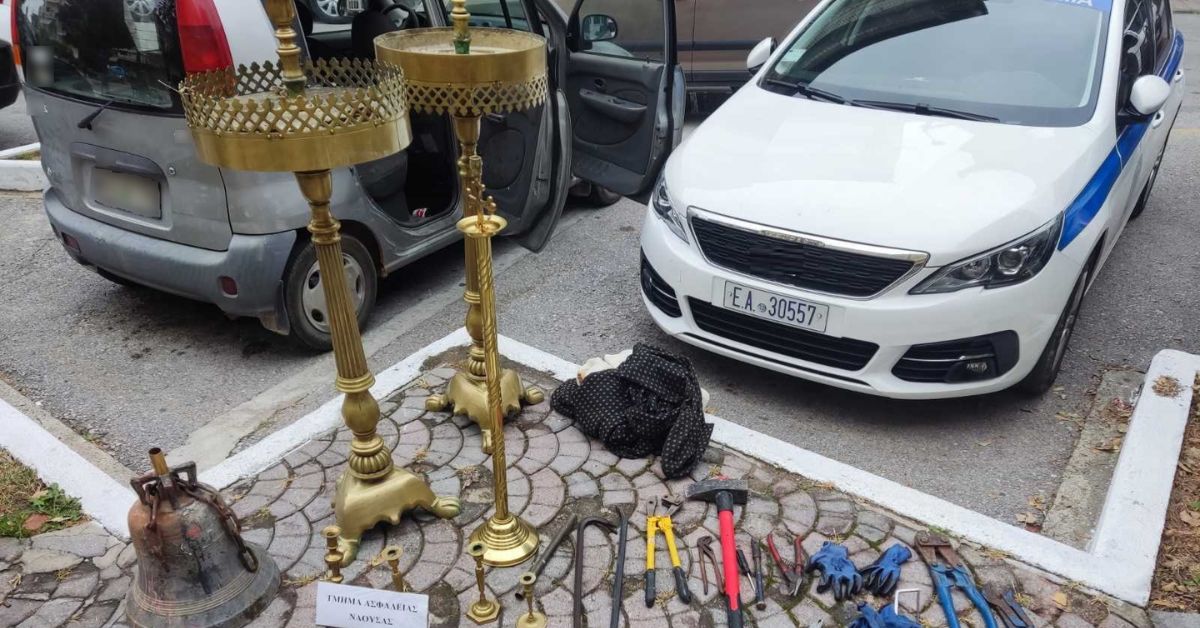 Ειδικότερα, μετά από συντονισμένες ενέργειες των αστυνομικών, εντοπίστηκαν οι προαναφερόμενοι άνδρες να επιβαίνουν σε όχημα και σε έρευνα που έγινε βρέθηκαν διάφορα εκκλησιαστικά είδη και μία καμπάνα, τα οποία είχαν αφαιρέσει νωρίτερα από 3 Ιερούς Ναούς σε περιοχές της Ημαθίας.