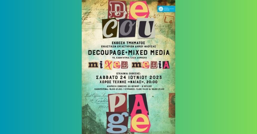 Το τμήμα ντεκουπάζ και μικτής τεχνικής (mixedmedia) των Εικαστικών Εργαστηρίων του Δήμου Νάουσας παρουσιάζει τις δημιουργίες των σπουδαστών του τμήματος του ακαδημαϊκού έτους 2022-2023 με την διδασκαλία και επιμέλεια της εκπαιδεύτριας κ. Έλσας Δημησκή.