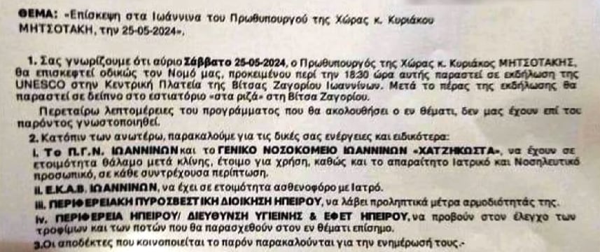 Σύμφωνα με έγγραφο που εστάλη, κατά την επίσκεψη του πρωθυπουργού στα Ιωάννινα μεταξύ των εκτάκτων μέτρων περιλαμβάνονται: