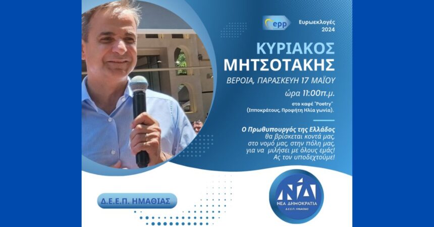 Ο Πρωθυπουργός και Πρόεδρος της Νέας Δημοκρατίας Κυριάκος Μητσοτάκης θα συναντήσει τους πολίτες στη Βέροια, την Παρασκευή 17 Μαΐου 2024 στις 11:00 π.μ. στο καφέ “Poetry” (Ιπποκράτους, Προφήτη Ηλία γωνία).