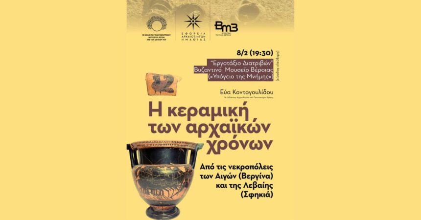 H Εφορεία Αρχαιοτήτων Ημαθίας και οι Φίλοι του Πολυκεντρικού Μουσείου των Αιγών και του Δικτύου του σας προσκαλούν στην διάλεξη της υπ. διδάκτορος Αρχαιολογίας στο Πανεπιστήμιο Κρήτης Εύας Κοντογουλίδου με θέμα «Η κεραμική των αρχαϊκών χρόνων από τις νεκροπόλεις των Αιγών (Βεργίνα) και της Λεβαίης (Σφηκιά)», στις 8/2 και ώρα 19:30 στο Βυζαντινό Μουσείο Βέροιας («Υπόγειο της Μνήμης»).