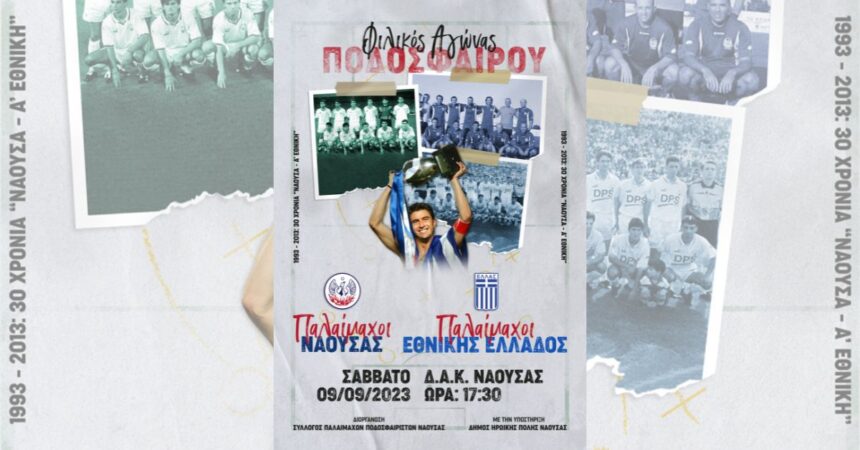 Ο Σύλλογος Παλαιμάχων Ποδοσφαιριστών της Νάουσας σε συνεργασία με τον Δήμο Ηρωικής Πόλης Νάουσας με αφορμή την συμπλήρωση 30 ετών από την ιστορική άνοδο της ομάδας της Νάουσας στην Α’ Εθνική Κατηγορία την περίοδο 1993-1994, διοργανώνουν το Σάββατο 9 Σεπτεμβρίου και ώρα 17:30 στο Δ.Α.Κ. Νάουσας φιλανθρωπικό φιλικό αγώνα ποδοσφαίρου μεταξύ των Παλαιμάχων Ποδοσφαιριστών της Νάουσας και Παλαιμάχων Ποδοσφαιριστών της Εθνικής Ελλάδος, μεταξύ των οποίων και μελών των Πρωταθλητών Ευρώπης του 2004.