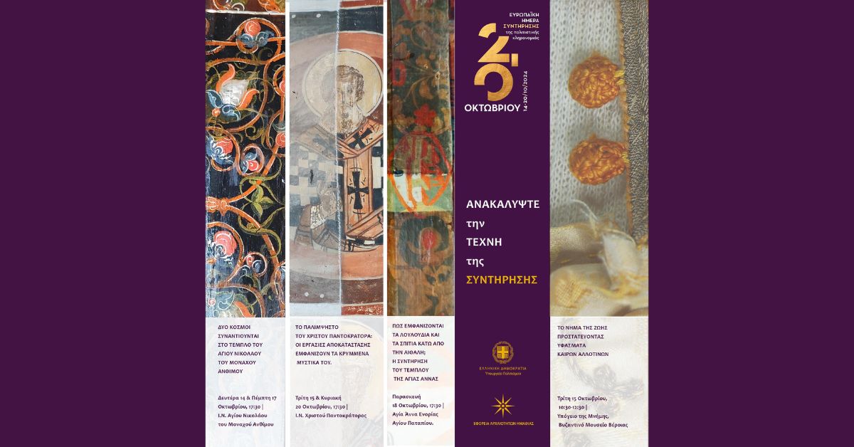 Η Εφορεία Αρχαιοτήτων Ημαθίας με χαρά ανακοινώνει σε μια σειρά εκδηλώσεων, που αναδεικνύουν την πλούσια πολιτιστική κληρονομιά της περιοχής μας, τη συμμετοχή της στον εορτασμό των Ευρωπαϊκών Ημερών Συντήρησης 2024. Ο εορτασμός είναι ένας θεσμός της Ευρωπαϊκής Συνομοσπονδίας Συλλόγων Συντηρητών (ECCO). Στόχος του είναι η γνωριμία του κοινού με την επιστήμη της συντήρησης και το επάγγελμα του συντηρητή αρχαιοτήτων & έργων τέχνης, καθώς και η ευαισθητοποίηση του στην ανάγκη συντήρησης της πολιτιστικής μας κληρονομιάς.