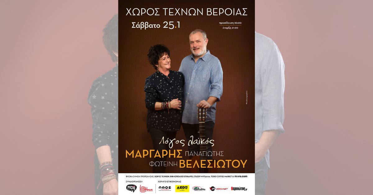 Ο βιρτουόζος κλασικός κιθαρίστας και συνθέτης Παναγιώτης Μάργαρης και η πηγαία ερμηνεύτρια Φωτεινή Βελεσιώτου μας παρουσιάζουν το Σάββατο 25 Ιανουαρίου στον Χώρο Τεχνών Βέροιας, τα παντοτινά διαμάντια του Μούτση, του Βίρβου, του Καλδάρα, του Γκάτσου, του Ξαρχάκου, του Ρασούλη και όχι μόνο.