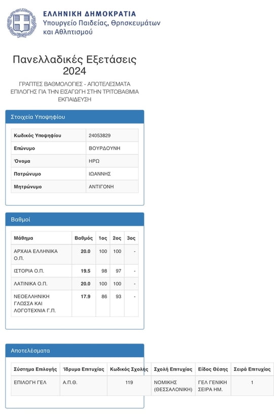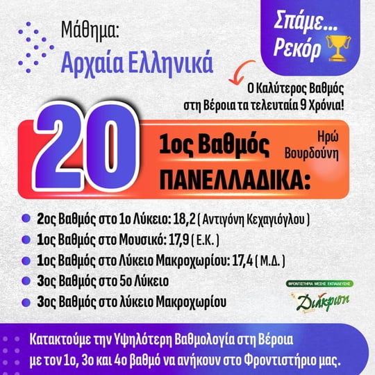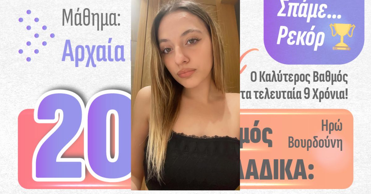Η Βουρδούνη Ηρώ είχε βαθμολογία στα ΑΡΧΑΙΑ – ΑΡΙΣΤΑ 100 και από τους δυο εξεταστές, η καλύτερη βαθμολογία στη Βέροια τα τελευταία 9 χρόνια και πρώτος βαθμός πανελλαδικά φέτος!!