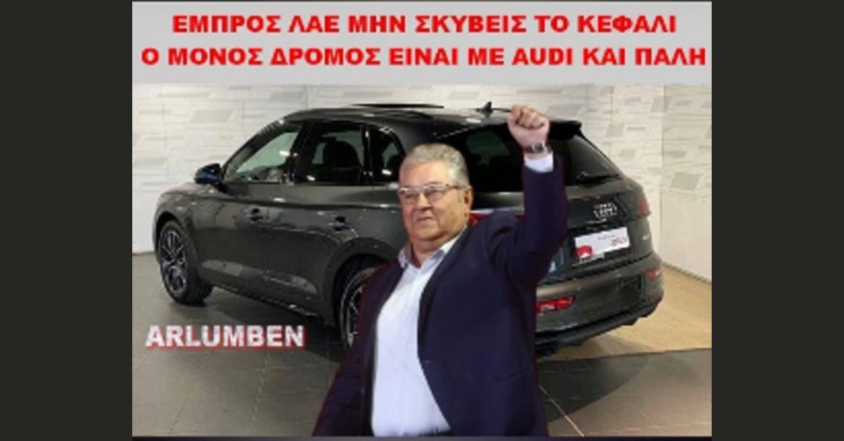 Τα κομματικά Lada δεν υπάρχουν πλέον. Ο σύντροφος Κουτσούμπας μετακινείται με ένα θηριώδες Audi Q5, «βιτρίνα» του «επάρατου καπιταλισμού» και αυτό. Θεσμική παραχώρηση σε αρχηγό κόμματος, από την Βουλή. Από τον κρατικό προϋπολογισμό που κατά τα άλλα είναι φορομπηχτικός , ανάλγητος και πίνει το αίμα του εργαζόμενου λαού. Με το Audi Q5 να προπορεύεται και τον λαό να ακολουθεί φωνάζοντας: «εμπρός λαέ, μη σκύβεις το κεφάλι, νόμος είναι το δίκιο του εργάτη»…