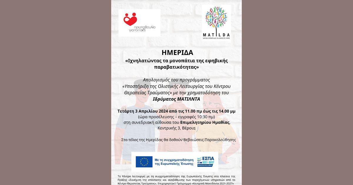 Το Κέντρο Αναφοράς, Παροχής Συμβουλευτικής και Θεραπείας Τραύματος της Πρωτοβουλίας για το Παιδί σας προσκαλεί στην Ημερίδα με θέμα: