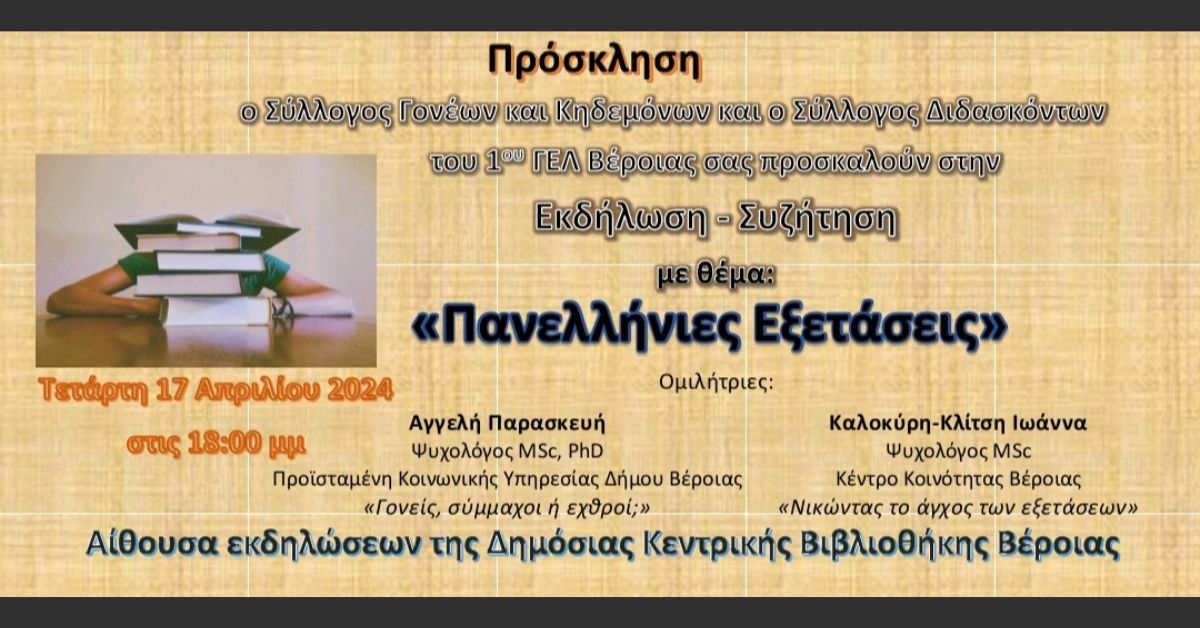 «Ο σύλλογος Γονέων και Κηδεμόνων και ο Σύλλογος Διδασκόντων του 1ου ΓΕΛ Βέροιας σας προσκαλούν, την Τετάρτη 17 Απριλίου 2024 στις 18:00, σε Εκδήλωση – Συζήτηση με θέμα «Πανελλήνιες Εξετάσεις» στην Κεντρική Βιβλιοθήκη Βέροιας»
