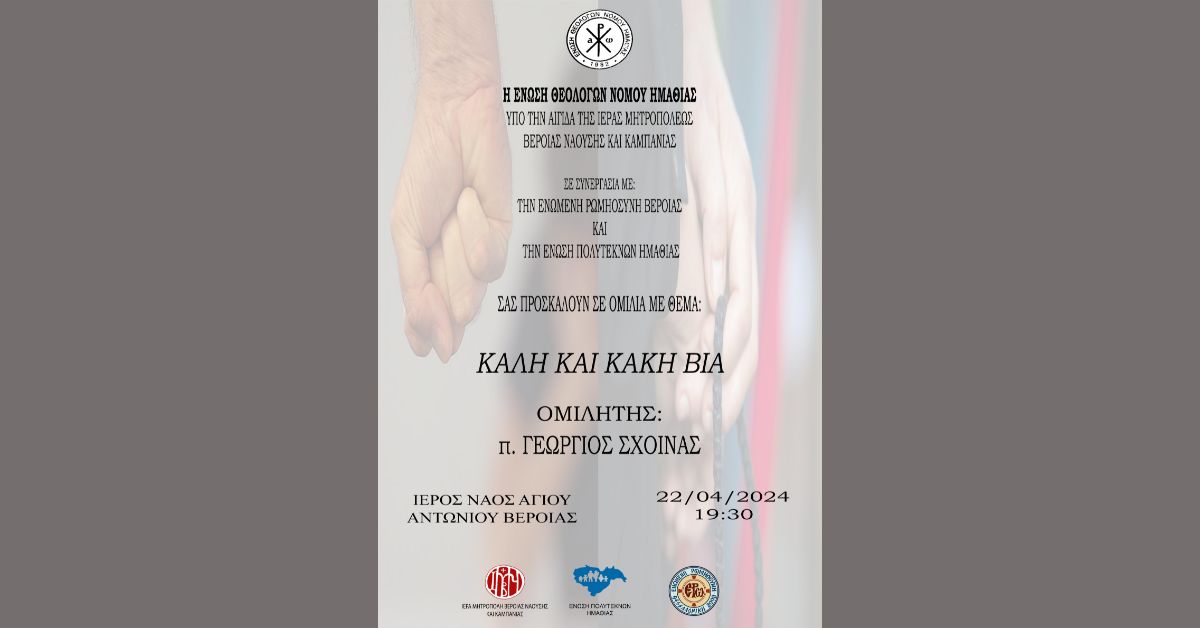 Η Ένωση Θεολόγων Νομού Ημαθίας σε συνεργασία με την Ιερά Μητρόπολη Βεροίας, Ναούσης & Καμπανίας, την Ενωμένη Ρωμηοσύνη Βέροιας & την Ένωση Πολυτέκνων Ημαθίας συνδιοργανώνουn εκδήλωση – ομιλία την Δευτέρα 22 Απριλίου 2024 και ώρα 7.30μμ. στον Ιερό Ναό Αγίου Αντωνίου Βέροιας με θέμα «Καλή και κακή βία».