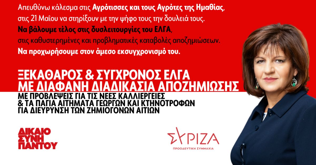 Απευθύνω κάλεσμα στις Αγρότισσες και τους Αγρότες της Ημαθίας, στις 21 Μαΐου να στηρίξουν με την ψήφο τους την δουλειά τους. Να βάλουμε τέλος στις δυσλειτουργίες του ΕΛΓΑ, στις καθυστερημένες και προβληματικές καταβολές αποζημιώσεων. Να προχωρήσουμε στον άμεσο εκσυγχρονισμό του.