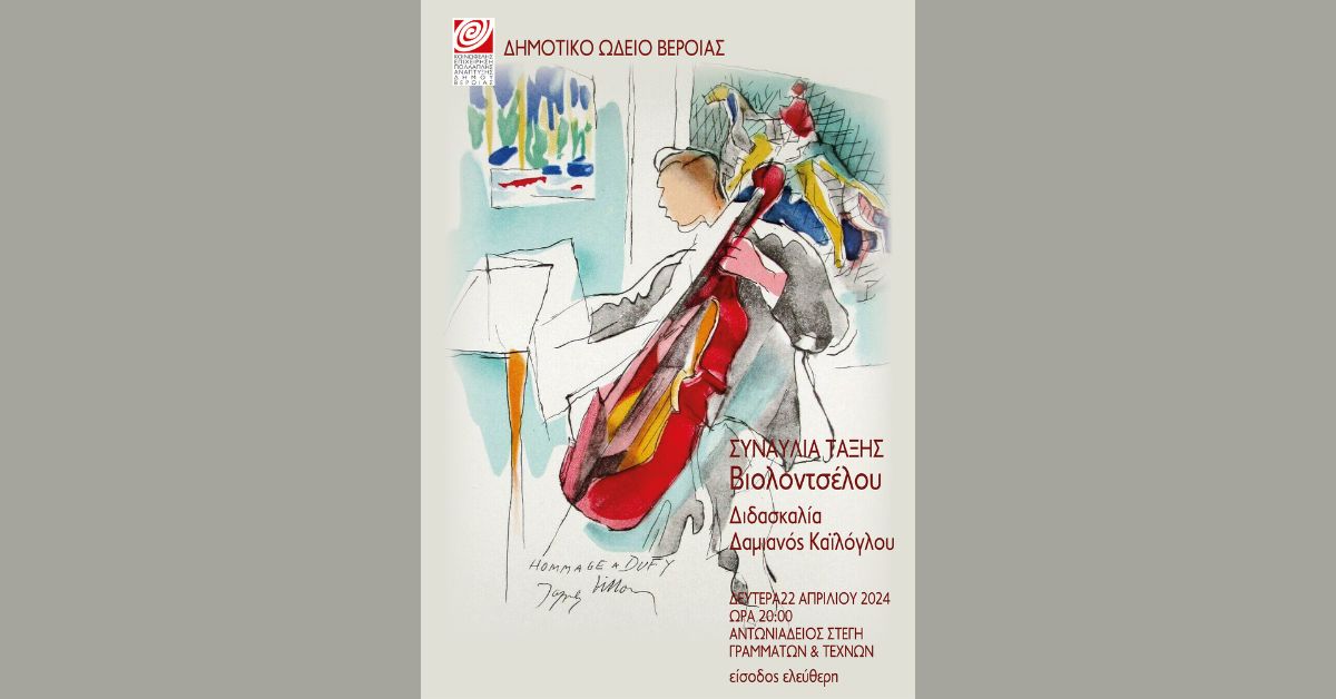 Σήμερα 22 Απριλίου και ώρα 8 μ.μ οι μαθητές της τάξης του βιολοντσέλου του Δημοτικού Ωδείου Βέροιας θα παρουσιάσουν στο πλαίσιο της εκπαιδευτικής χρονιάς 2023-2024 συναυλία με έργα των B. Marcello, A. Vivaldi, J.B.Breval, J.S.Bach και άλλων συνθετών.
