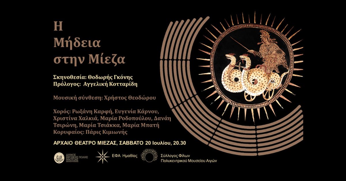 - Σάββατο 20 Ιουλίου, ώρα 20:30, Αρχαίο Θέατρο Μίεζας: Θεατρική παράσταση: «Η Μήδεια στη Μίεζα»