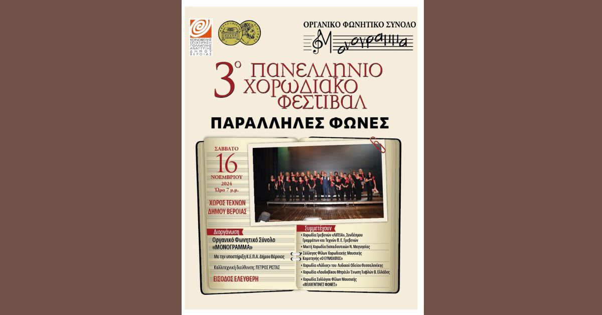 Το Οργανικό Φωνητικό Σύνολο “Μονόγραμμα διοργανώνει και θα παρουσιάσει το 3ο Πανελλήνιο Φεστιβάλ χορωδιών “ΠΑΡΑΛΛΗΛΕΣ ΦΩΝΕΣ”, το Σάββατο 16 Νοεμβρίου, και ώρα 7.μμ. στον Χώρο Τεχνών Βέροιας. Συμμετέχουν οι χορωδίες: ΛΙΓΕΙΑ Συνδέσμου Γραμμάτων και Τεχνών Γρεβενών. Μικτή Χορωδία Εκπαιδευτικών Ν.Μαγνησίας. Σύλλογος Φίλων Χορωδιακής Μουσικής Κομοτηνής Ευμολός Χορωδία ΛΥΔΙΟΣ του Λαδικού Ωδείου Θεσσαλονίκης Χορωδία “Λουδοβίκου Μπρειλ” Ένωση Τυφλών Βορείου Ελλάδος Χορωδία Συλλόγου Φιλώ Μουσικής “Βελβεντινές Φωνές”