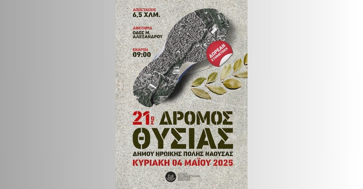 Ο Δήμος Ηρωικής Πόλης Νάουσας στο πλαίσιο εορτασμού της 203ης Επετείου του Ολοκαυτώματος της πόλης (27 Απριλίου 2025), σε συνεργασία με αθλητικούς συλλόγους της Νάουσας, διοργανώνει την Κυριακή 4 Μαΐου 2025 τον αγώνα δρόμου «21ος Δρόμος Θυσίας». Η εκκίνηση του αγώνα θα γίνει στην οδό Μ. Αλεξάνδρου (συμβολή με οδό Βασ. Φιλίππου) στις 09:00 το πρωί.