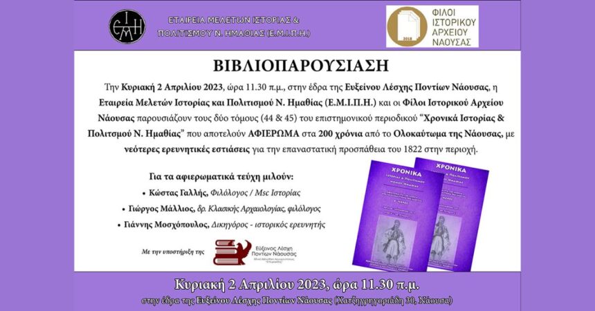 Η Εταιρεία Μελετών Ιστορίας και Πολιτισμού Ν. Ημαθίας (Ε.Μ.Ι.Π.Η.) και οι Φίλοι Ιστορικού Αρχείου Νάουσας παρουσιάζουν τους δύο τόμους (44 & 45) του επιστημονικού περιοδικού “Χρονικά Ιστορίας & Πολιτισμού Ν. Ημαθίας” της Ε.Μ.Ι.Π.Η. που αποτελούν ΑΦΙΕΡΩΜΑ στα 200 χρόνια από το Ολοκαύτωμα της Νάουσας, την Κυριακή 2 Απριλίου 2023, ώρα 11.30 πμ, στην έδρα της Ευξείνου Λέσχης Ποντίων Νάουσας (Χατζηγρηγοριάδη 30, Νάουσα).