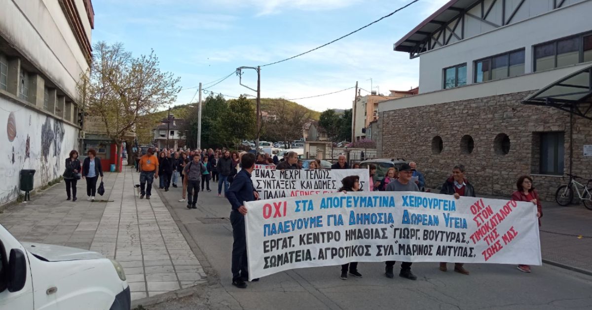 Με συνθήματα όπως «δώστε λεφτά για την υγεία όχι φακελάκια για τα χειρουργεία» και «κάτω τα χέρια από τα νοσοκομεία, δικαίωμα μας είναι η δωρεάν υγεία», πραγματοποίησαν δυναμική πορεία στους δρόμους της πόλης η οποία ολοκληρώθηκε στην κεντρική πλατεία.