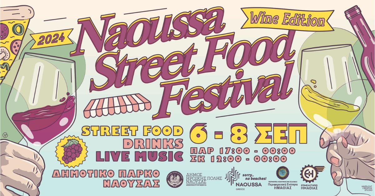 O Δήμος Ηρωικής Πόλης Νάουσας σε συνεργασία με την Περιφερειακή Ενότητα Ημαθίας, το Επιμελητήριο Ημαθίας και την ομάδα «Soulfood Thessaloniki» (Thessaloniki Street Food Festival & Thessaloniki Beer Festival) και με οδηγό τη γεύση, διοργανώνουν το «Naousa Street Food Festival 2024 – Wine Edition» στο πλακόστρωτο του Δημοτικού Πάρκου της Νάουσας.