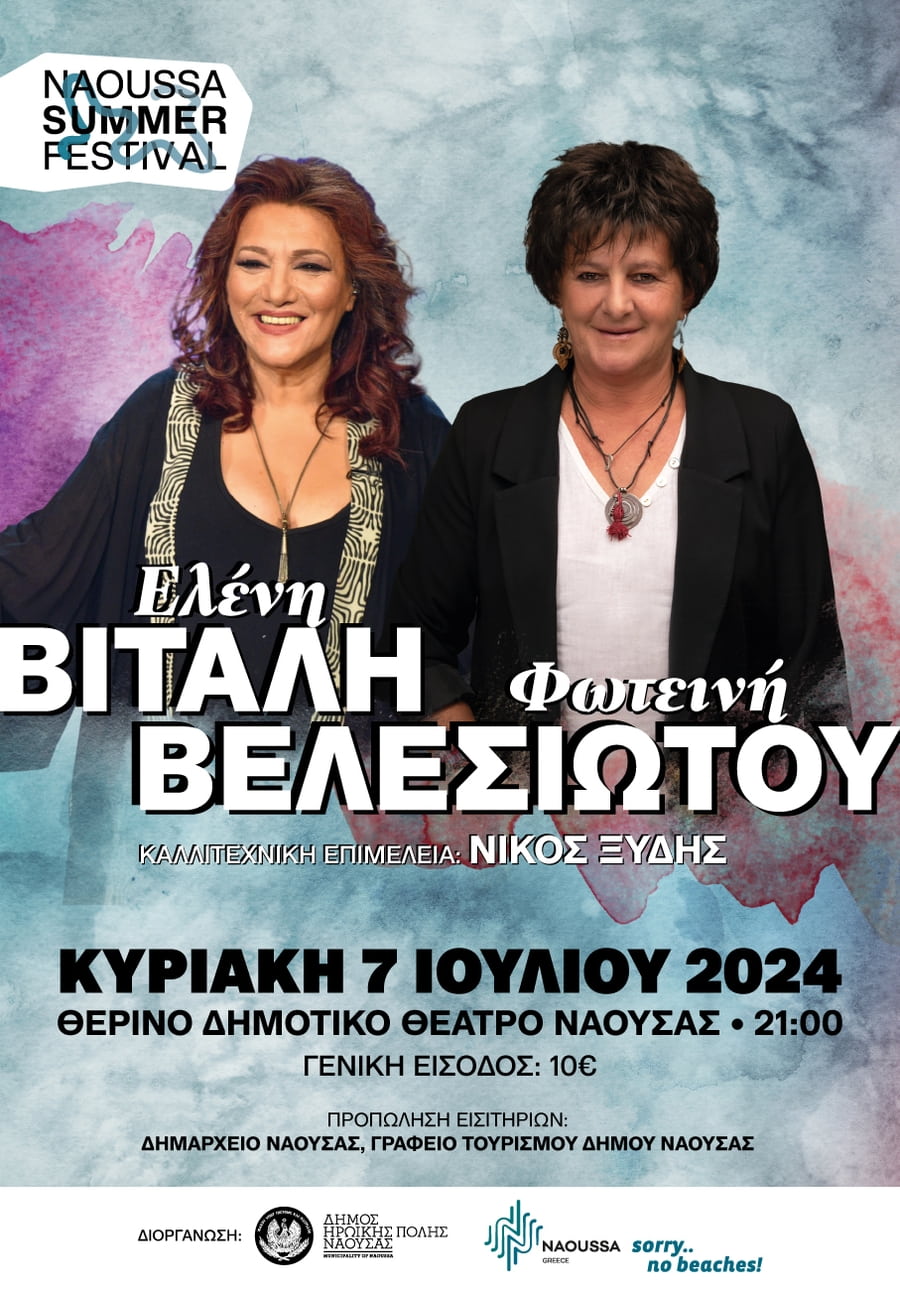 Η Ελένη Βιτάλη και η Φωτεινή Βελεσιώτου για πρώτη φορά μαζί επί σκηνής! Στην όμορφη παρέα τους θα βρίσκονται οι δυναμικοί και ανατρεπτικοί Τζουμ. Οι δύο ξεχωριστές ερμηνεύτριες θα μας χαρίσουν απλόχερα, επιτυχίες από τη δισκογραφία τους αλλά και τραγούδια αγαπημένα που έχουν αφήσει εποχή. Δεν διστάζουν μάλιστα να πειραματιστούν με τις φρέσκιες ενορχηστρώσεις του Νίκου Ξύδη, ενώνοντας το έντεχνο, το λαϊκό, το ρεμπέτικο και το παραδοσιακό τραγούδι με τρόπο μοναδικό, ξεσηκώνοντάς μας να ζήσουμε μαζί τους αξέχαστες καλοκαιρινές βραδιές!