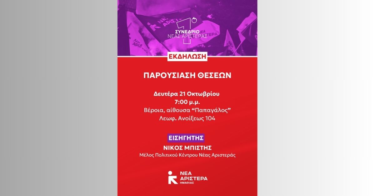 Η ΝΕΑ ΑΡΙΣΤΕΡΑ Ημαθίας στο πλαίσιο του προσυνεδριακού διαλόγου ενόψει του 1ου συνεδρίου της Νέας Αριστεράς σας προσκαλεί στην ανοιχτή εκδήλωση για την παρουσίαση θέσεων που θα πραγματοποιηθεί στην Βέροια την Δευτέρα 21/10 στις 7 μμ στην Αίθουσα «Παπαγάλος « (Ανοίξεως 104).