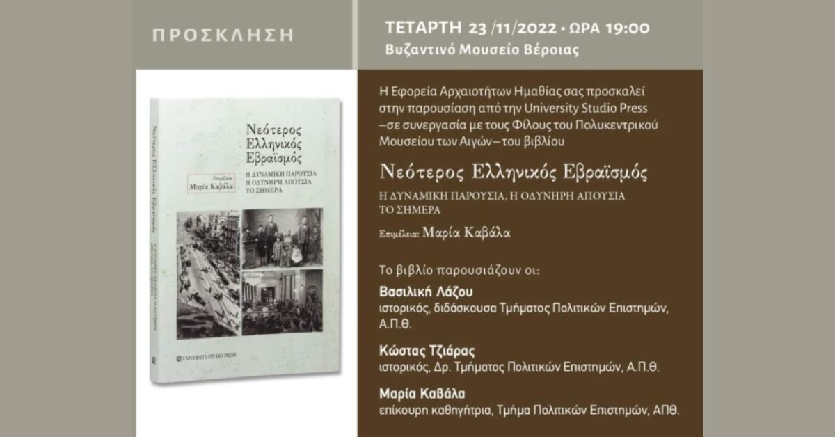 Οι Φίλοι του Πολυκεντρικού Μουσείου των Αιγών και του Δικτύου του σε συνεργασία με την Εφορεία Αρχαιοτήτων Ημαθίας και τον εκδοτικό οίκο University Studio Press, σας προσκαλούν την Τετάρτη (23/11) και ώρα 19:00 στην παρουσίαση του βιβλίου της Μαρίας Καβάλα (Επ. Καθηγήτρια Πολιτικών Επιστημών Α.Π.Θ.) με τίτλο «Νεότερος ελληνικός εβραϊσμός (Η δυναμική παρουσία, η οδυνηρή απουσία, το σήμερα)», που θα πραγματοποιηθεί στο Βυζαντινό Μουσείο της Βέροιας (“Υπόγειο της Μνήμης”).