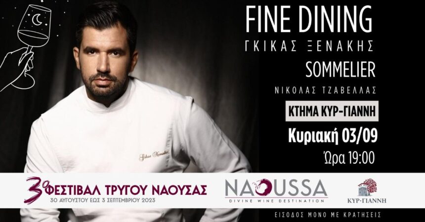 Την Κυριακή 03 Σεπτεμβρίου 2023 και ώρα 19:00, ο βραβευμένος σεφ Γκίκας Ξενάκης μαγειρεύει πιάτα υψηλής γαστρονομίας και ο Ναουσαίος σομελιέ Νικόλας Τζαβέλλας συνδυάζει μαζί τους εξαιρετικά κρασιά του αμπελώνα. Η εκδήλωση θα πραγματοποιηθεί