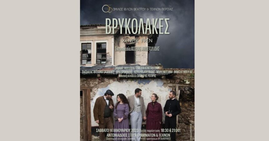 Ο Όμιλος Φίλων Θεάτρου & Τεχνών Βέροιας θα παρουσιάσει τους “Βρυκόλακες” του Χένρικ Ίψεν σε σκηνοθεσία Κώστα Αποστολίδη, το Σάββατο 14 Ιανουαρίου 2023(18:30 & 21:00), στην Αντωνιάδειο Στέγη Γραμμάτων & Τεχνών.