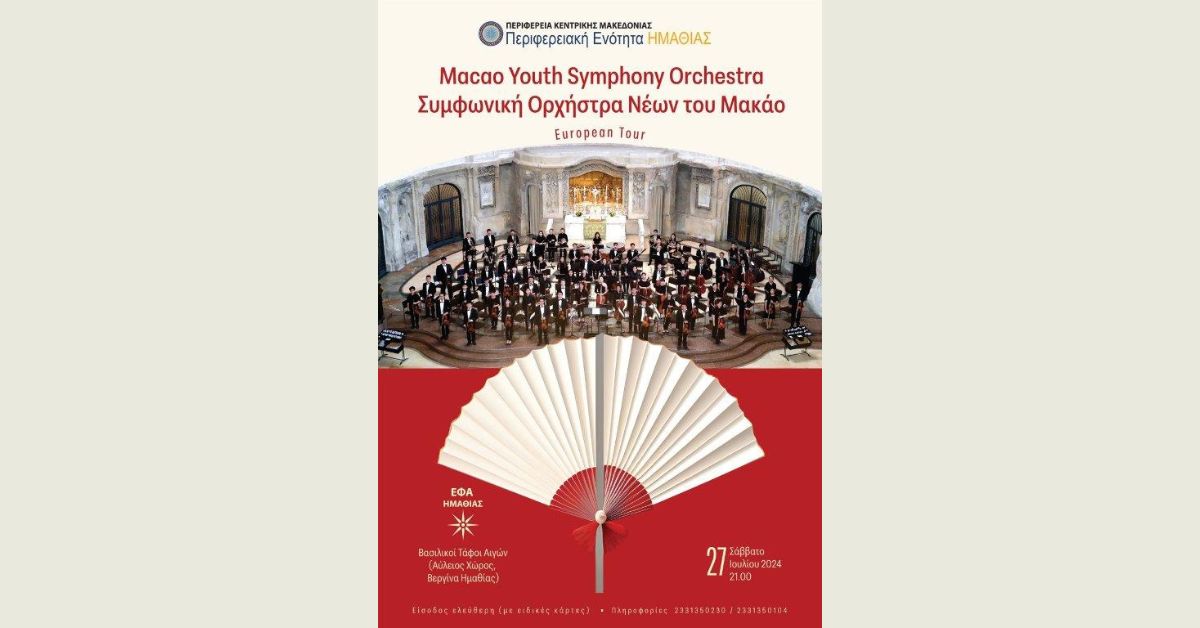 Η Περιφερειακή Ενότητα και η Εφορεία Αρχαιοτήτων Ημαθίας υποδέχονται την Macao Youth Symphony Orchestra / Συμφωνική Ορχήστρα Νέων του Μακάο, μία από τις σπουδαιότερες νεανικές Ορχήστρες της Κίνας, για μία και μοναδική συναυλία κλασικής μουσικής που θα πραγματοποιηθεί το Σάββατο 27 Ιουλίου 2024, ‘ώρα 9.00μ.μ., στο Μουσείο Βασιλικών Τάφων των Αιγών, στη Βεργίνα , με ελεύθερη για το κοινό είσοδο (με την επίδειξη κάρτας ελεύθερης εισόδου) .