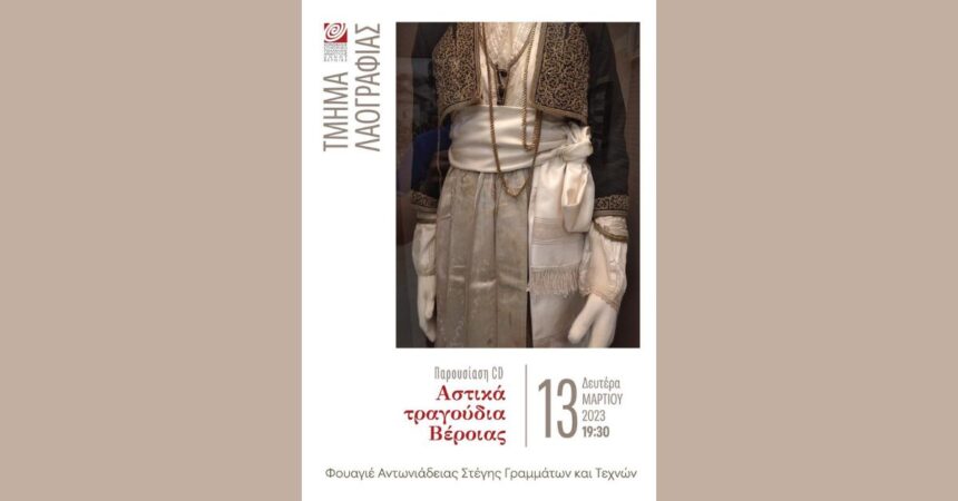 H ΚΕΠΑ Δήμου Βέροιας / Τμήμα Λαογραφίας παρουσιάζει το cd «Αστικά τραγούδια της Βέροιας” την Δευτέρα 13 Μαρτίου 2023, ώρα 7.30μ.μ. στο φουαγιέ της Αντωνιάδειας Στέγη Γραμμάτων & Τεχνών. Για την έκδοση επιλέχθηκαν 14 αντιπροσωπευτικά τραγούδια και σκοποί τόσο από τον κύκλο της κοινωνικής ζωής, κυρίως τραγούδια της αγάπης, όσο και από τον κύκλο του χρόνου.