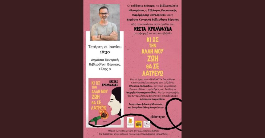 Οι εκδόσεις Διόπτρα, το βιβλιοπωλείο «Ηλιοτρόπιο», ο Σύλλογος Κοινωνικής Παρέμβασης «Έρασμος» και η Δημόσια Κεντρική Βιβλιοθήκη Βέροιας σας προσκαλούν στην ομιλία του Κώστα Κρομμύδα, με αφορμή το νέο του βιβλίου «Κι ως την άλλη μου ζωή θα σε λατρεύω», την Τετάρτη 21 Ιουνίου 2023 στις 18.30 στην αίθουσα εκδηλώσεων της Δημόσιας Κεντρικής Βιβλιοθήκης, Έλλης 8.