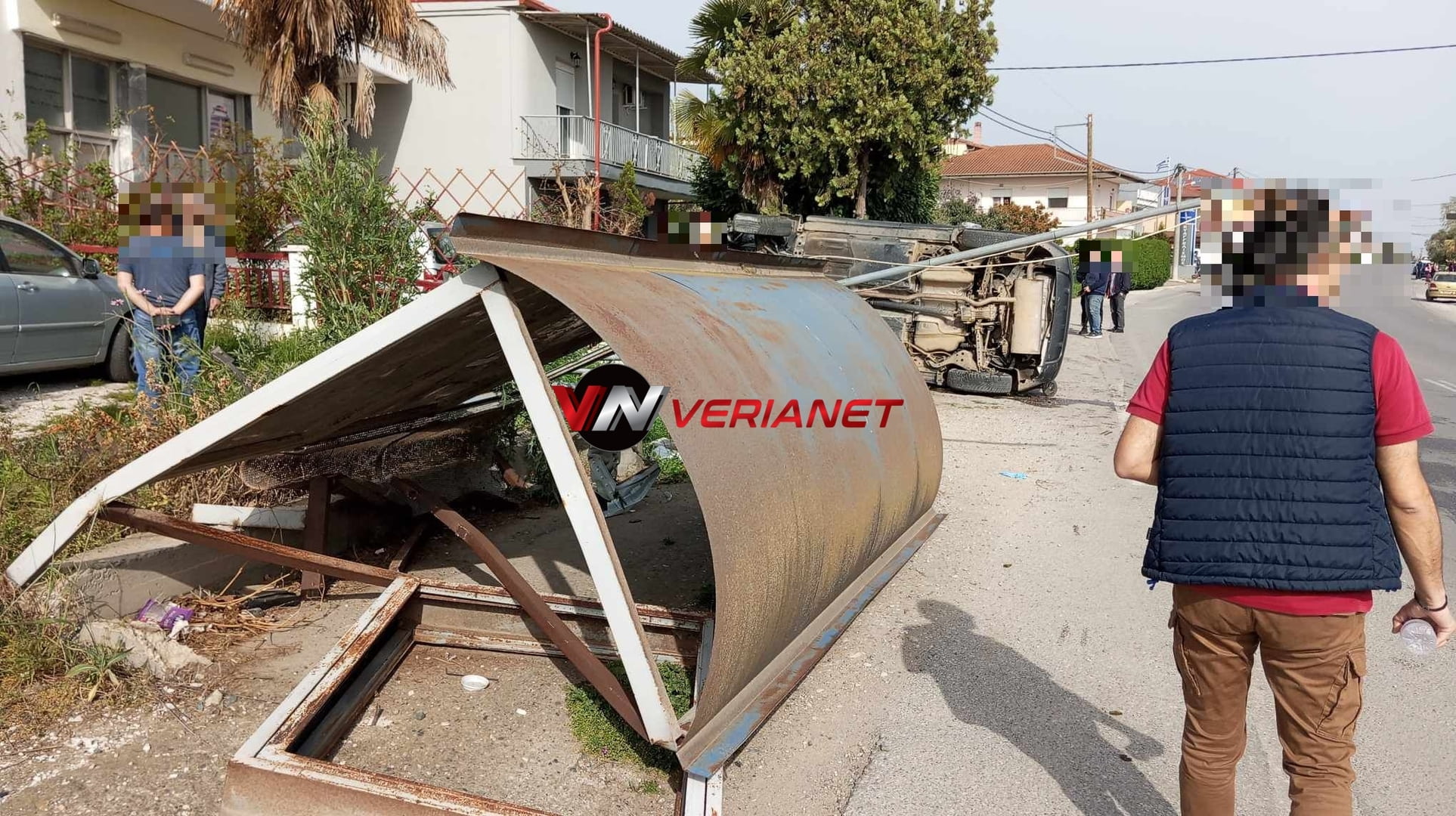 Ι.Χ. επιβατικό αυτοκίνητο, το οποίο οδηγούσε 64χρονος, κάτοικος Νάουσας, με κατεύθυνση από Βέροια προς Νάουσα, στο ύψος του γηπέδου, πέρασε στο αντίθετο ρεύμα και έπεσε επάνω στο στέγαστρο στάσης λεωφορείων.