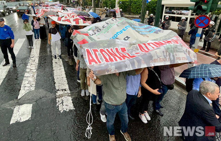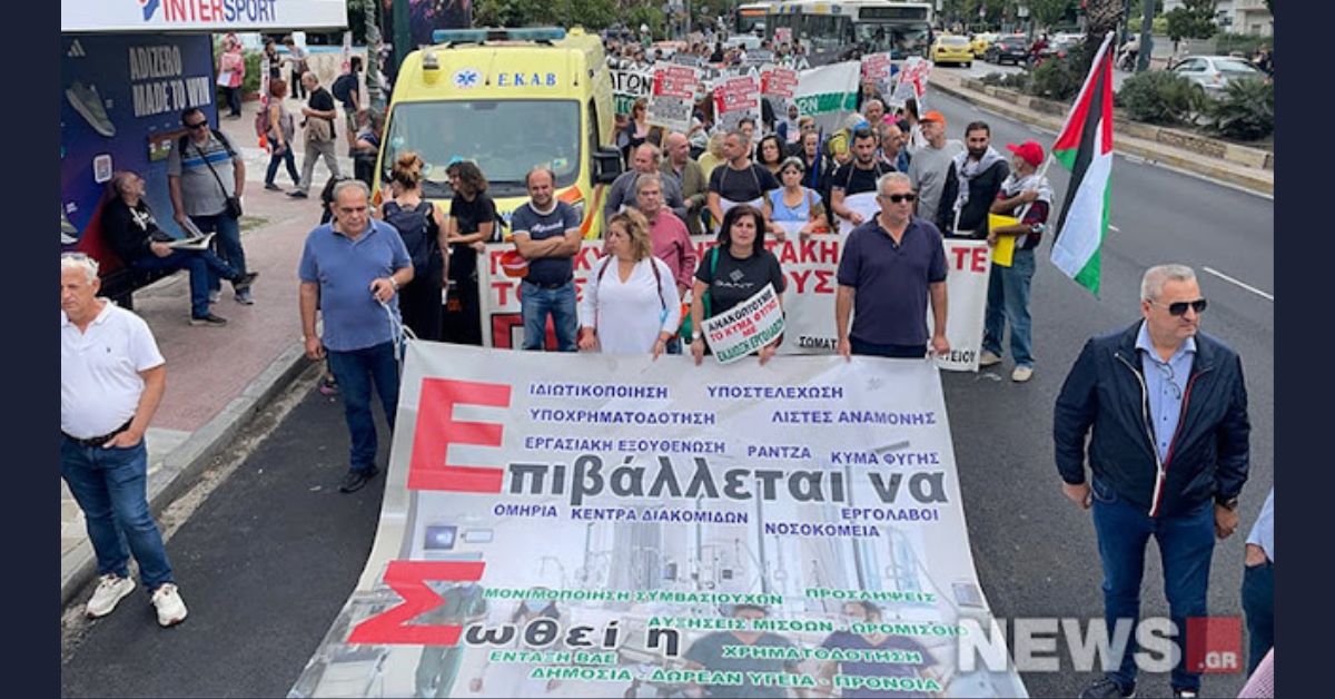 Στη συνέχεια, κάτω από τη βροχή στο κέντρο της Αθήνας, οι εργαζόμενοι κατευθύνθηκαν προς το Σύνταγμα και το Υπουργείο Οικονομικών. Κρατώντας πανό και σημαίες της Παλαιστίνης, οι εργαζόμενοι διαδήλωσαν για τα δικαιώματά τους. Κύριο σύνθημά τους είναι το «Επιβάλλεται να σωθεί η υγεία».
