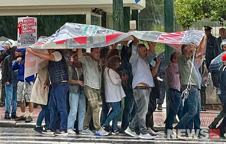 Οι διαδηλωτές δεν φάνηκε να πτοούνται από τη βροχή, ακόμα και αν δεν την περίμεναν. Βάζοντας τα πανό πάνω από το κεφάλι τους για να προστατευτούν, προχώρησαν με κατεύθυνση το σημείο έξω από τη Βουλή. Το ίδιο όμως έκαναν και κάποιοι αστυνομικοί των ΜΑΤ, που σήκωσαν τις ασπίδες και τις έκαναν για ομπρέλα πάνω στα κεφάλια τους.