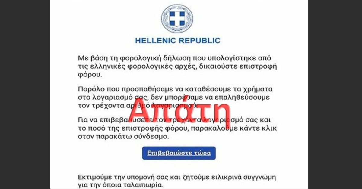 Αν σας έρθει κάποιο μήνυμα για «επιστροφή φόρου», μην βιαστείτε να χαρείτε!!! Αντίθετα, επιδείξτε τη δέουσα προσοχή!!