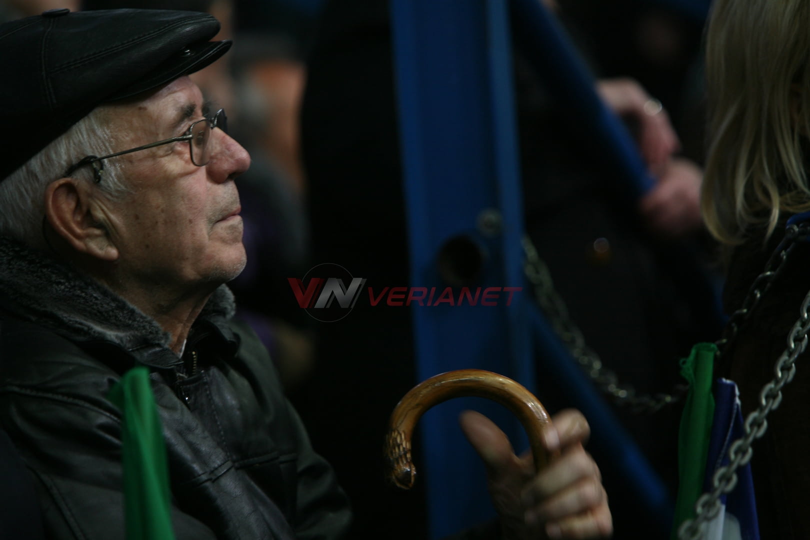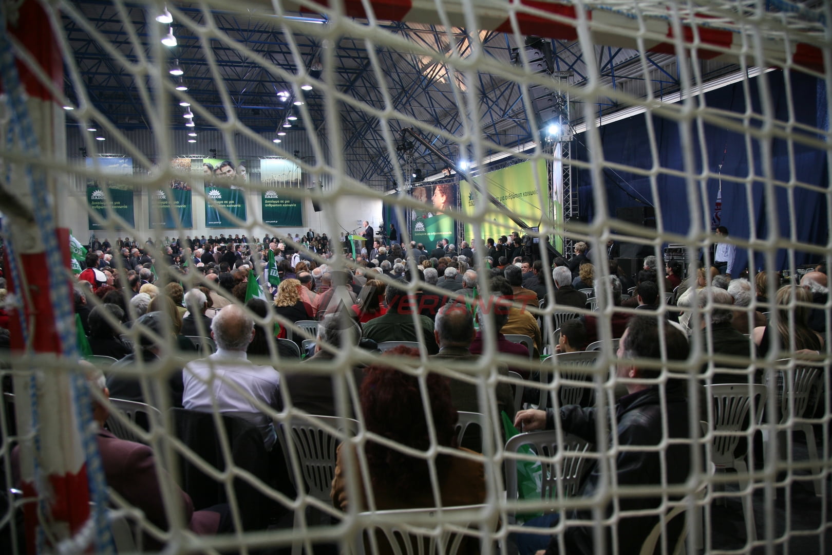 Στο κατάμεστο «Φιλίππειο» δημιουργείται το αδιαχώρητο. Πολύς κόσμος μένει εκτός αίθουσας και παρακολουθεί την ομιλία από τα μεγάφωνα που έχουν τοποθετηθεί έξω.