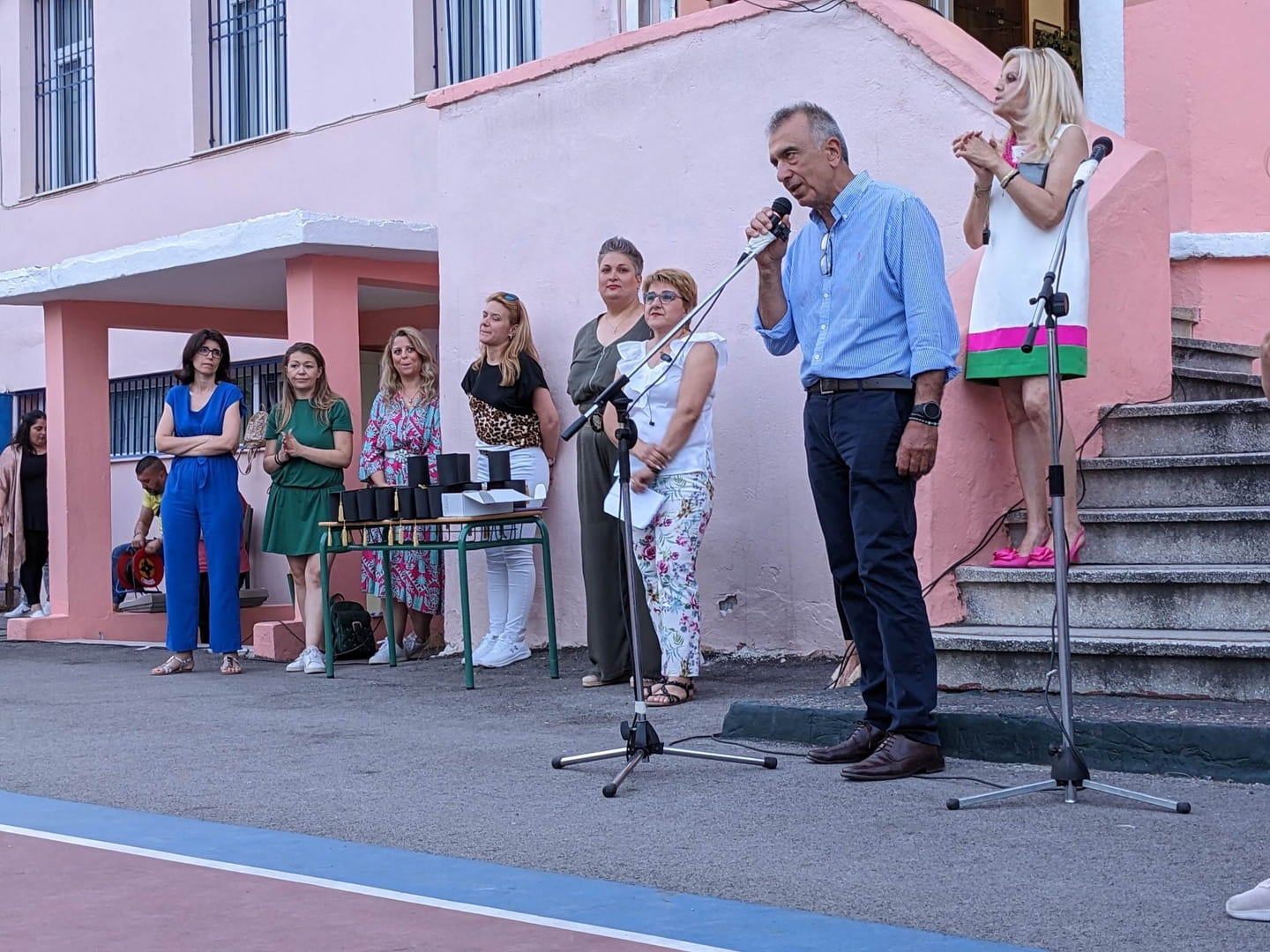 Ο Διευθυντής Κωνσταντίνος Ζαφειρίου αποχαιρέτησε τα παιδιά της έκτης υπενθυμίζοντάς τους ότι η αγκαλιά του 5ου θα είναι πάντα ανοιχτή γι’ αυτούς.