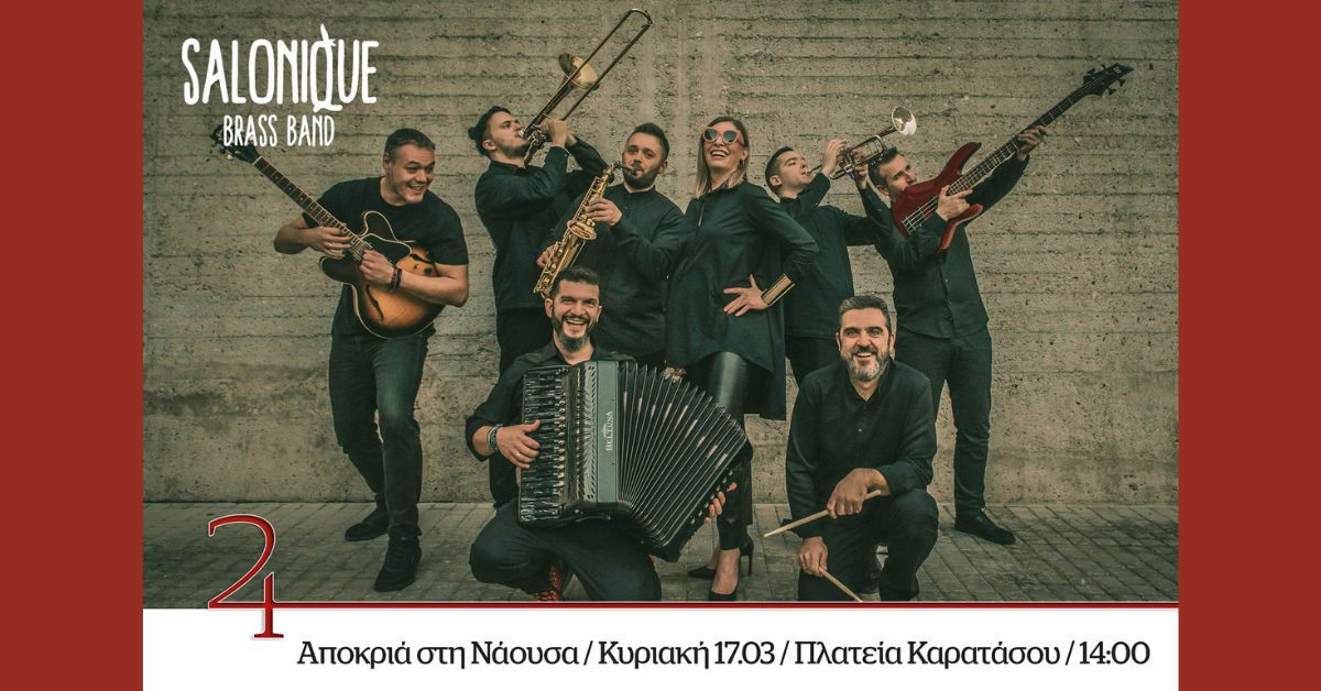 Ο Δήμος Ηρωικής Πόλης Νάουσας στο πλαίσιο των εκδηλώσεων “Νάουσα – Αποκριά 2024” διοργανώνει συναυλία με το μουσικό σχήμα “Salonique Brass Band” την Κυριακή της Αποκριάς 10 Μαρτίου 2024 και ώρα 14:00 στην Πλατεία Καρατάσου με ελεύθερη είσοδο για το κοινό.