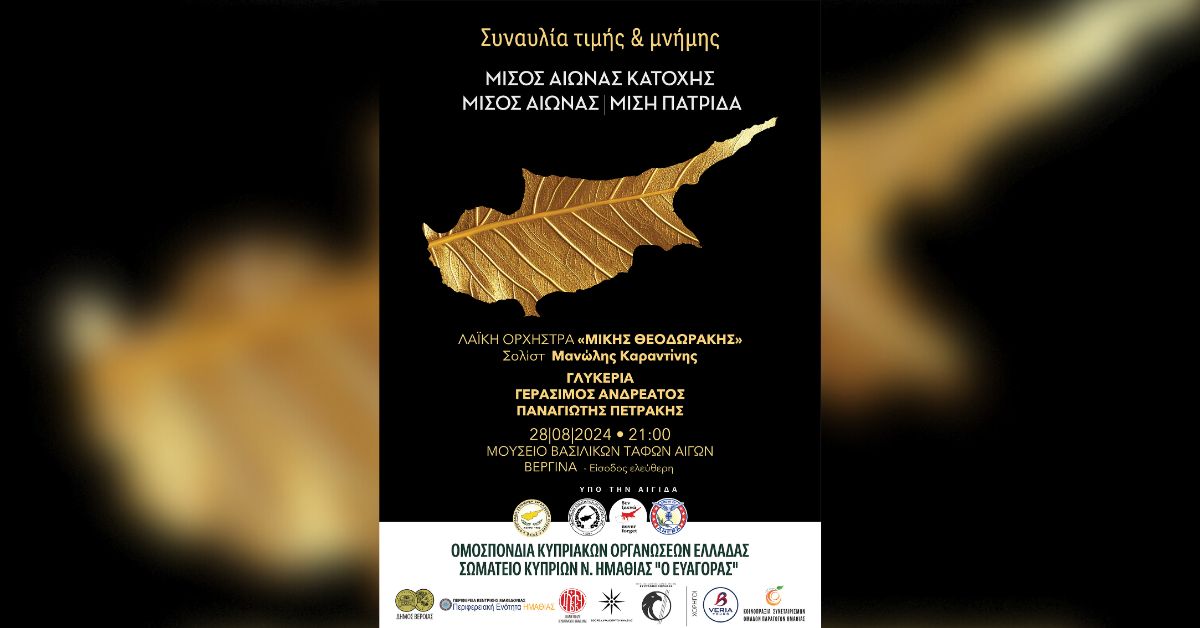 Στο πλαίσιο των εκδηλώσεων του 2024 για την επέτειο των 50 χρόνων τουρκικής κατοχής στην Κύπρο, η Ομοσπονδία Κυπριακών Οργανώσεων Ελλάδας (Ο.Κ.Ο.Ε.) και ο Σωματείο Κυπρίων Ν. Ημαθίας «Ο Ευαγόρας» με αίσθημα ευθύνης απέναντι στην Ιστορία και σε αγαστή συνεργασία με τον Δήμο Βέροιας, την Περιφέρεια Κεντρικής Μακεδονίας – Περιφερειακή Ενότητα Ημαθίας, την Ιερά Μητρόπολη Βεροίας, Ναούσης και Καμπανίας, την Εφορεία Αρχαιοτήτων Ημαθίας, τον Παγκύπριο Σύνδεσμο Αμερικής, την PSEKA, την AHEPA HELLAS, την Κοινοπραξία Συνεταιρισμών Ομάδων Παραγωγών Ημαθίας και τον Πολιτιστικό Σύλλογο Πατρίδας «Ευστάθιος Χωραφάς», διοργανώνουν συναυλία την Τετάρτη 28 Αυγούστου, 9:00 μ.μ. στον αύλειο χώρο των Βασιλικών Τάφων των Αιγών στη Βεργίνα, με την Ανεξάρτητη Λαϊκή Ορχήστρα «Μίκης Θεοδωράκης» και με τη συμμετοχή των σπουδαίων Ελλήνων ερμηνευτών Γλυκερίας, Γεράσιμου Ανδρεάτου και Παναγιώτη Πετράκη.