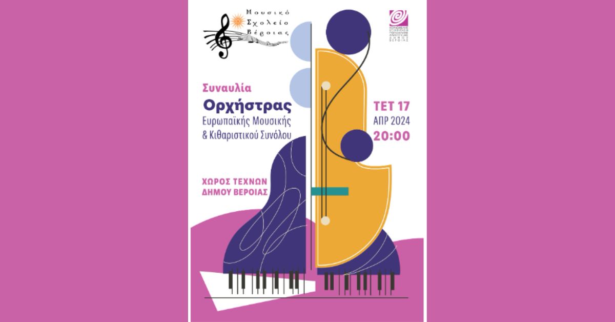 Σας προσκαλούμε στη συναυλία της Ορχήστρας Ευρωπαϊκής Μουσικής και του Κιθαριστικού Συνόλου του Μουσικού Σχολείου Βέροιας, που θα πραγματοποιηθεί στον Χώρο Τεχνών την Τετάρτη 17 Απριλίου 2024 και ώρα 20:00.