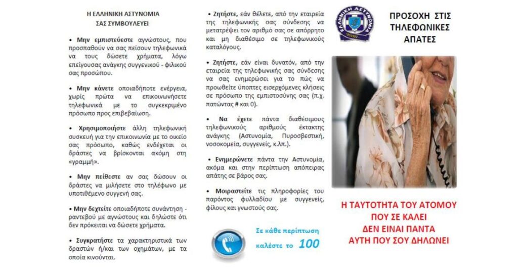 - Μην εμπιστεύεστε αγνώστους, που προσπαθούν να σας πείσουν τηλεφωνικά να τους δώσετε χρήματα, λόγω επείγουσας ανάγκης συγγενικού – φιλικού σας προσώπου.