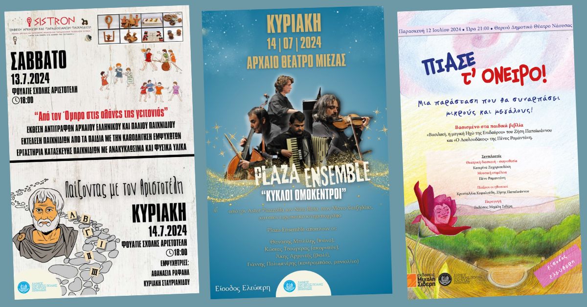 Μετά το ιδιαίτερα επιτυχημένο τριήμερο μουσικών συναυλιών του “Naoussa Summer Festival 2024” που διοργανώνει ο Δήμος Ηρωικής Πόλης Νάουσας, οι εκδηλώσεις συνεχίζονται στο Πολιτιστικό Κέντρο της Σχολής Αριστοτέλους και στο Αρχαίο Θέατρο Μίεζας με ελεύθερη είσοδο για το κοινό. Το αναλυτικό πρόγραμμα έχει ως εξής: