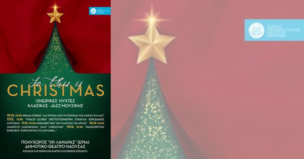Χριστούγεννα χωρίς μουσική, δε γίνονται! Για πρώτη φορά ο Δήμος Νάουσας μεταμορφώνει τον 1ο όροφο του κτιρίου ΕΡΙΑ σε μαγικό σημείο συνάντησης και μουσικής σύμπραξης και παρουσιάζει μια σειρά δράσεων με ελεύθερη είσοδο, φιλοξενώντας κορυφαίους καλλιτέχνες υψίστου κύρους από την Ελλάδα και το εξωτερικό,σε μια διαφορετική χριστουγεννιάτικη γιορτή!