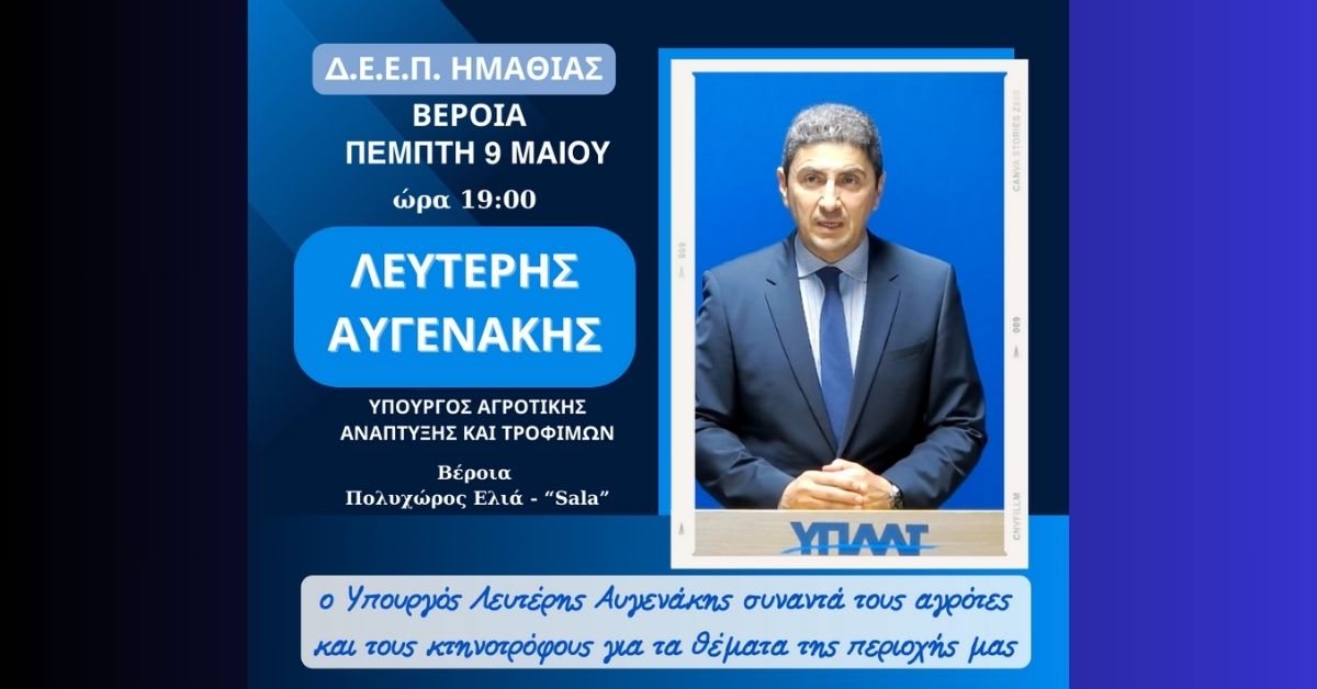 Την Πέμπτη 9 Μαΐου και ώρα 19:00 ο Υπουργός Αγροτικής Ανάπτυξης και Τροφίμων κ. Λευτέρης Αυγενάκης θα βρίσκεται στην Ημαθία, στη Βέροια, στο Πολυχώρο της Ελιάς όπου θα συναντηθεί με αγρότες, κτηνοτρόφους και φορείς και θα έχει συζήτηση για θέματα της περιοχής αλλά και το σχεδιασμό του υπουργείου για το μέλλον της πρωτογενούς παραγωγής στη χώρα μας.