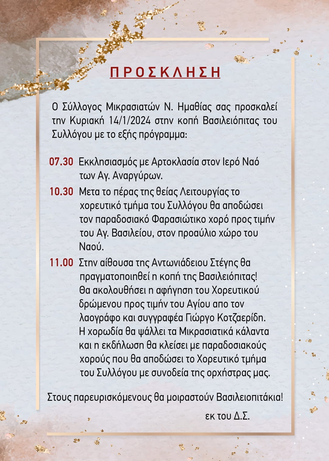 Ο Σύλλογος Μικρασιατών Ν. Ημαθίας σας προσκαλεί την προσεχή Κυριακή 14/1/2024 και ώρα 11.00 π.μ. στην Αντωνιάδειο Στέγη στην κοπή της Βασιλειόπιτας , παρουσία του Μικρασιάτη Ιεράρχου μας κ.κ.Παντελεήμονος.
