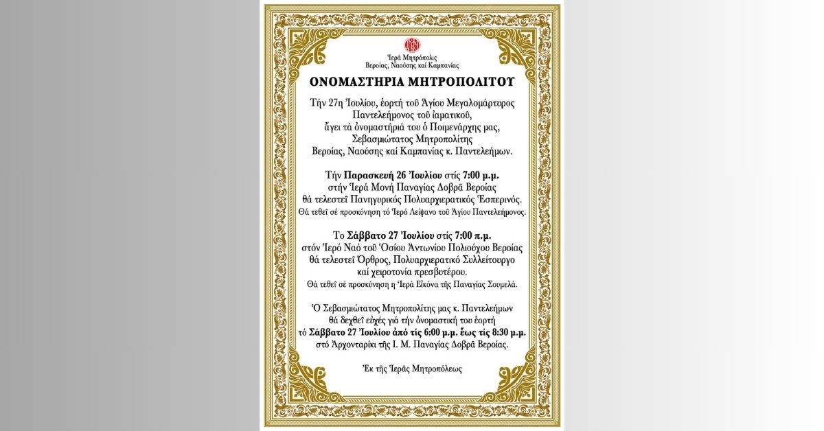 Ὁ Σεβασμιώτατος Μητροπολίτης μας κ. Παντελεήμων θά δεχθεῖ εὐχές γιά τήν ὀνομαστική του ἑορτή τό Σάββατο 27 Ἰουλίου ἀπό τίς 6:00 μ.μ. ἕως τίς 8:30 μ.μ. στό Ἀρχονταρίκι τῆς Ι. Μ. Παναγίας Δοβρᾶ Βεροίας.