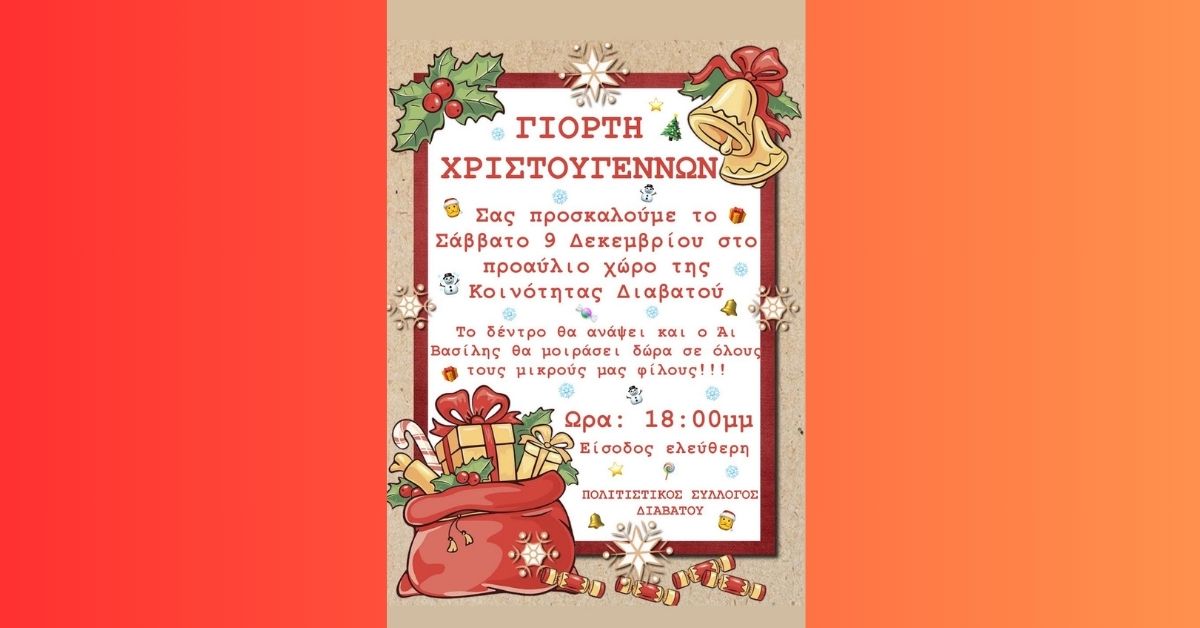 Σας προσκαλούμε τo Σάββατο 09/12/2023 και ώρα 18:00 μ.μ στη Πλατεία της Τοπικής Κοινότητας Διαβατού, στην έναρξη των εορταστικών μας εκδηλώσεων,
