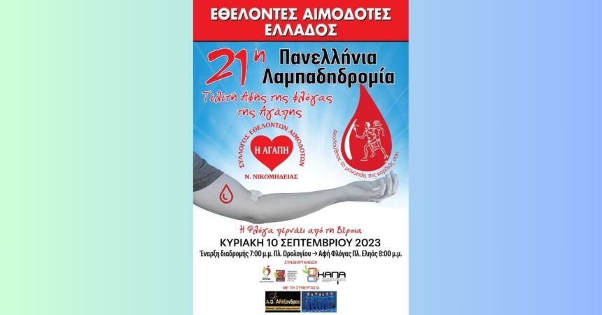 Σας προσκαλούμε στην άφιξη της “Φλόγας της Αγάπης” της 21ης Πανελλήνιας Λαμπαδηδρομίας Συλλόγων Εθελοντών Αιμοδοτών που θα πραγματοποιηθεί στην πλατεία Ελιάς σε συνεργασία με τον σύλλογο Α.Ο. Αλέξανδρος Βέροιας την Κυριακή 10 Σεπτεμβρίου 2023 στις 8 το απόγευμα.