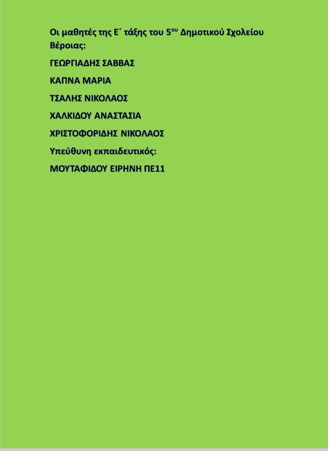 Συγκεκριμένα το Ε2 τμήμα της πέμπτης τάξης του σχολείου μας συμμετείχε στον συγκεκριμένο διαγωνισμό, στις κατηγορίες «Δημιουργία Παιχνιδιού» με δύο επιτραπέζια παιχνίδια και «Δημιουργία Τραγουδιού» με την σύνθεση και ερμηνεία ενός τραγουδιού. Υπεύθυνη εκπαιδευτικός της δράσης αυτής είναι η καθηγήτρια φυσικής αγωγής του σχολείου μας κ.Ειρήνη Μουταφίδου.