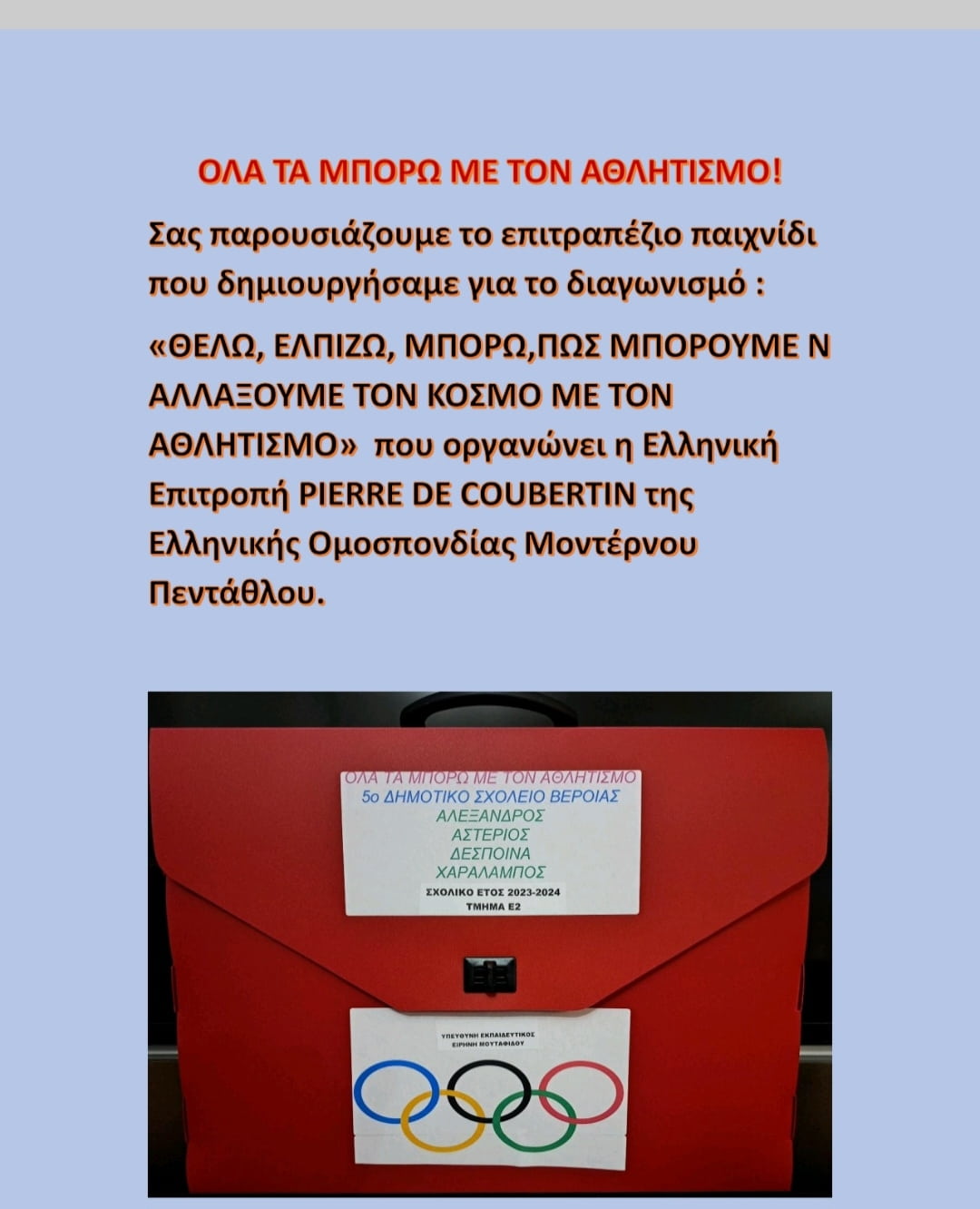 “Το σχολείο μας είχε την χαρά να συμμετέχει στον 2ο Διεθνή Μαθητικό Διαγωνισμό «Pierre de Coubertin» με τίτλο «ΘΕΛΩ ΕΛΠΙΖΩ ΜΠΟΡΩ- ΠΩΣ ΜΠΟΡΟΥΜΕ ΝΑ ΑΛΛΑΞΟΥΜΕ ΤΟΝ ΚΟΣΜΟ ΜΕ ΤΟΝ ΑΘΛΗΤΙΣΜΟ» για το σχολικό έτος 2023-2024.